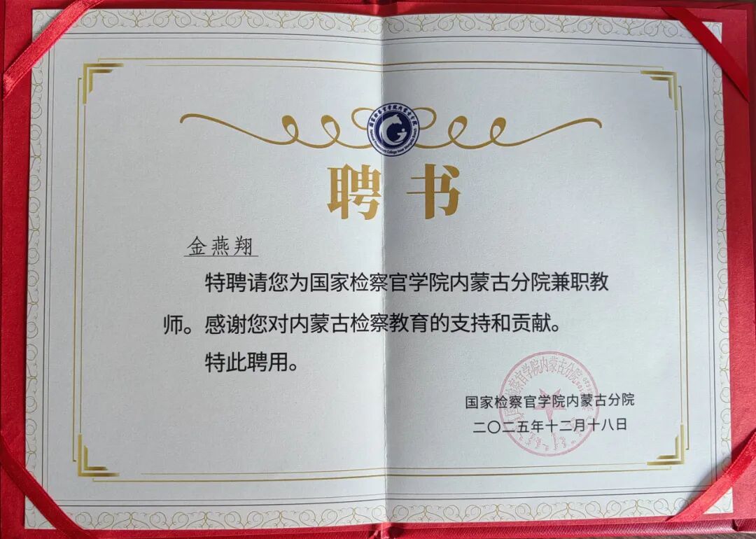 近日,回民区人民检察院检察官金燕翔正式受聘为国家检察官学院内蒙古分院兼职教师。