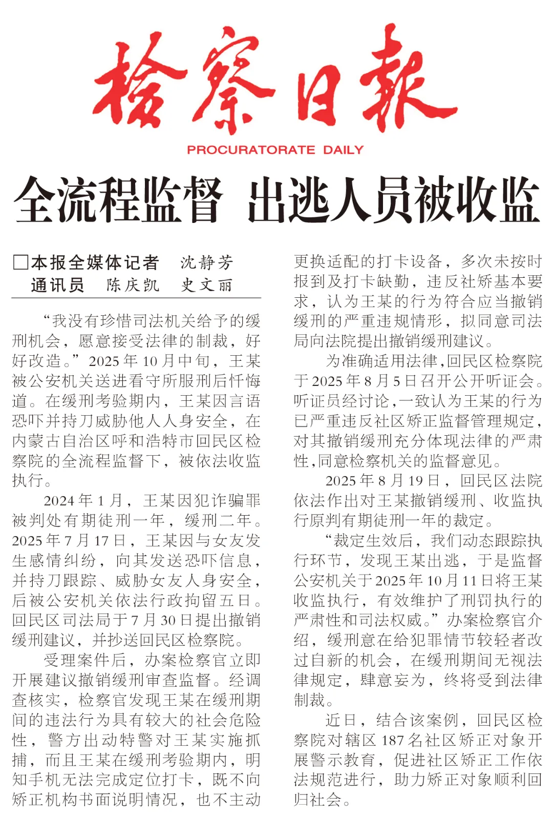 “裁定生效后,我们动态跟踪执行环节,发现王某出逃,于是监督公安机关于2025年10月11日将王某收监执行,有效维护了刑罚执行的严肃性和司法权威。”办案检察官介绍,缓刑意在给犯罪情节较轻者改过自新的机会,在缓刑期间无视法律规定,肆意妄为,终将受到法律制裁。